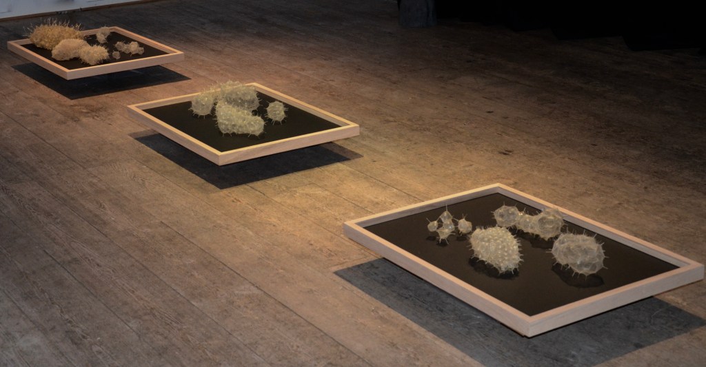 tm‘s contribution is part of a new series of works taking off from the fate of a particular mine pit lake in the Jämtland mountains. Local experiences and politics from the region of Stekenjokk and its abandoned ore mine function as backdrop for an exploration of the relationship between nature and humanity, as well as the notion of endings. With equal parts humor and sincerity, tm presents an installation that lends voice and body to various ephemeral actors and provides them with a stage to express themselves.