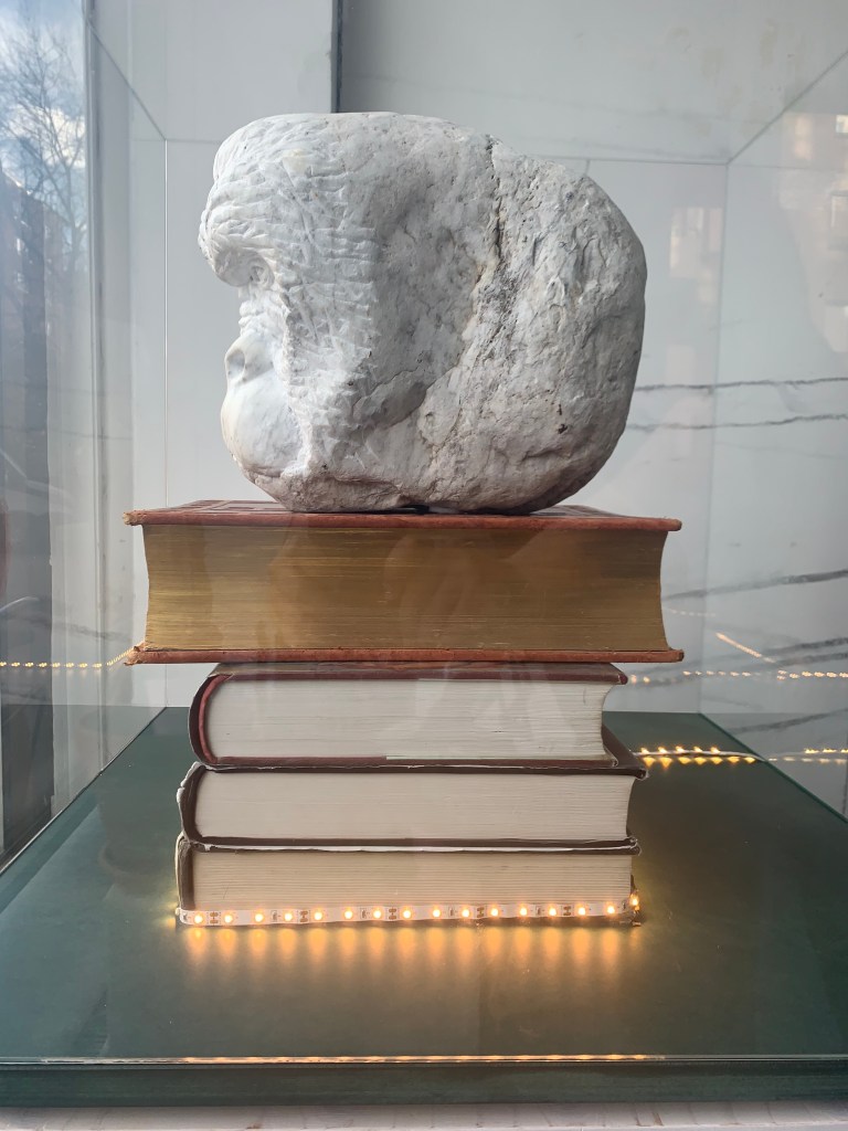 was tumbled round in the river. A sculptor finds it in the dry riverbed. She sees him and with her chisels and hammer helps him come forward.