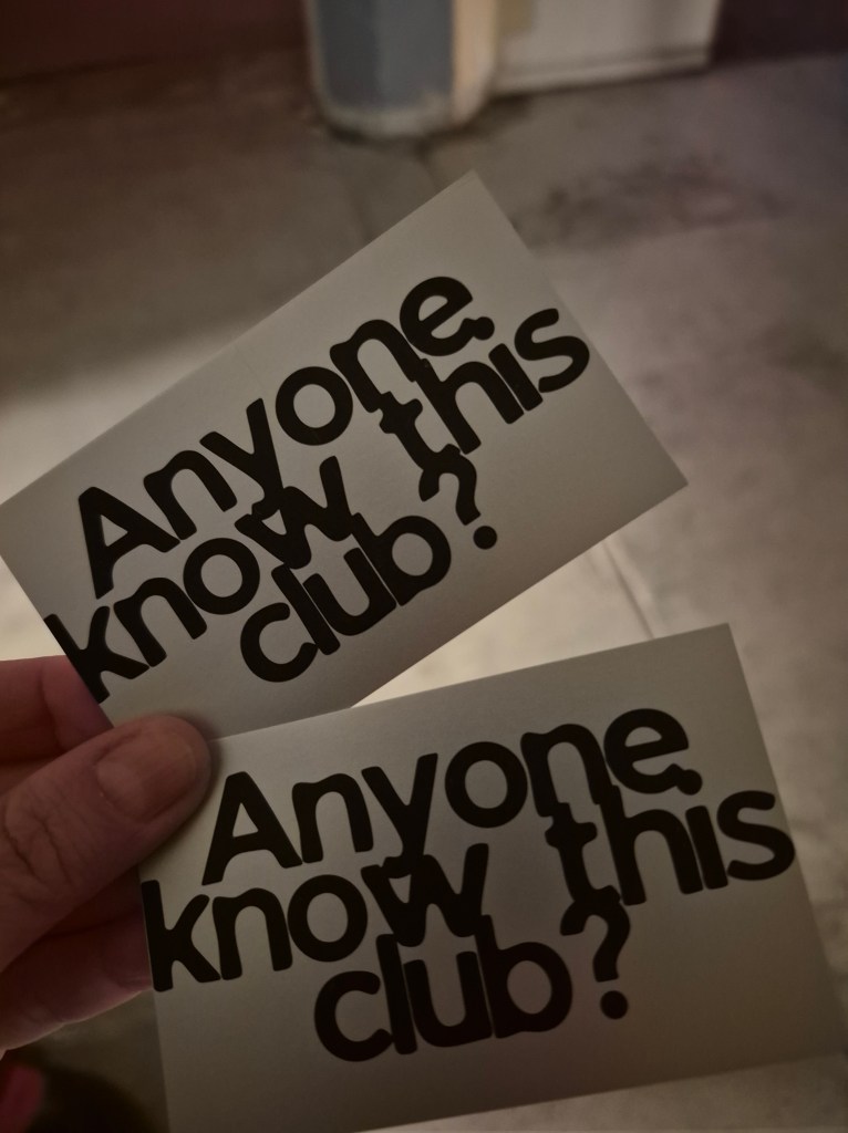 År senare blir dessa banala lämningar kraftfulla kärl för berättelser. Genom en arkeologisk process av febrilt sökande, gräver André Córdova Rudstedt och Ingeborg Kraft Fermin fram resterna av vad som en gång var skenbar intimitet. Det som gått förlorat väcks till liv igen. Anyone know this club? bjuder in till en klibbig, laddad, och lite pervers iscensättning — ett mättat tillstånd mellan sanning och påhitt.