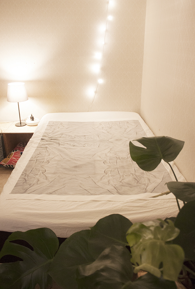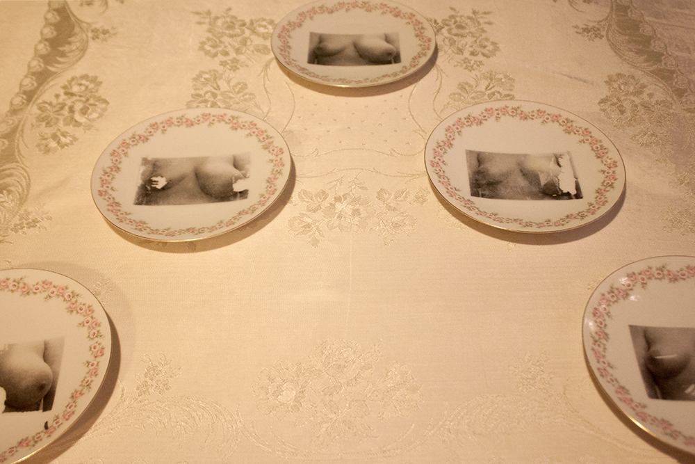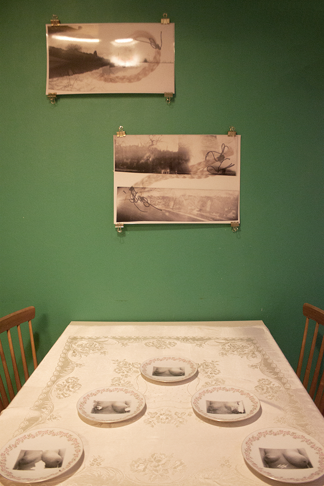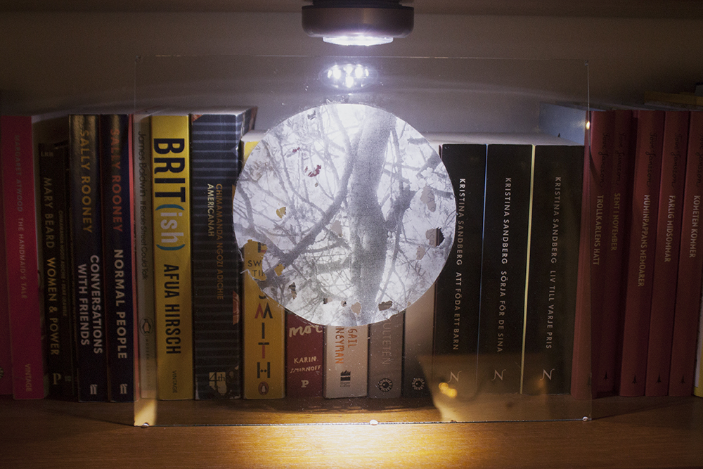 I first became interested in Jaana Sundström’s work because of the unconventional surfaces that she uses for printing and transferring photographs. –We recognise a range of everyday objects from our homes: plates and clothes; a blanket, a mirror, or a photo album. We see them merge into the exhibition space of the apartment as they become a part of someone else’s home, at first sight difficult to differentiate from the permanent interior.