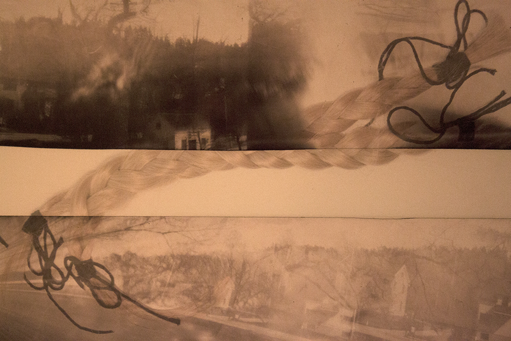 The black and white, partially coloured photographs are printed, pressed or sewed onto the common objects. They show various motives, such as sceneries from nature, houses or a detail of a gown, often in a zoomed in perspective, and not covering up flaws or damages. The artist directs the gaze and forces the viewer to look closely at a certain focus point, never giving the whole picture. The narrowed scope imposes upon someone else’s private sphere; coming too close and challenging our feelings of discomfort.