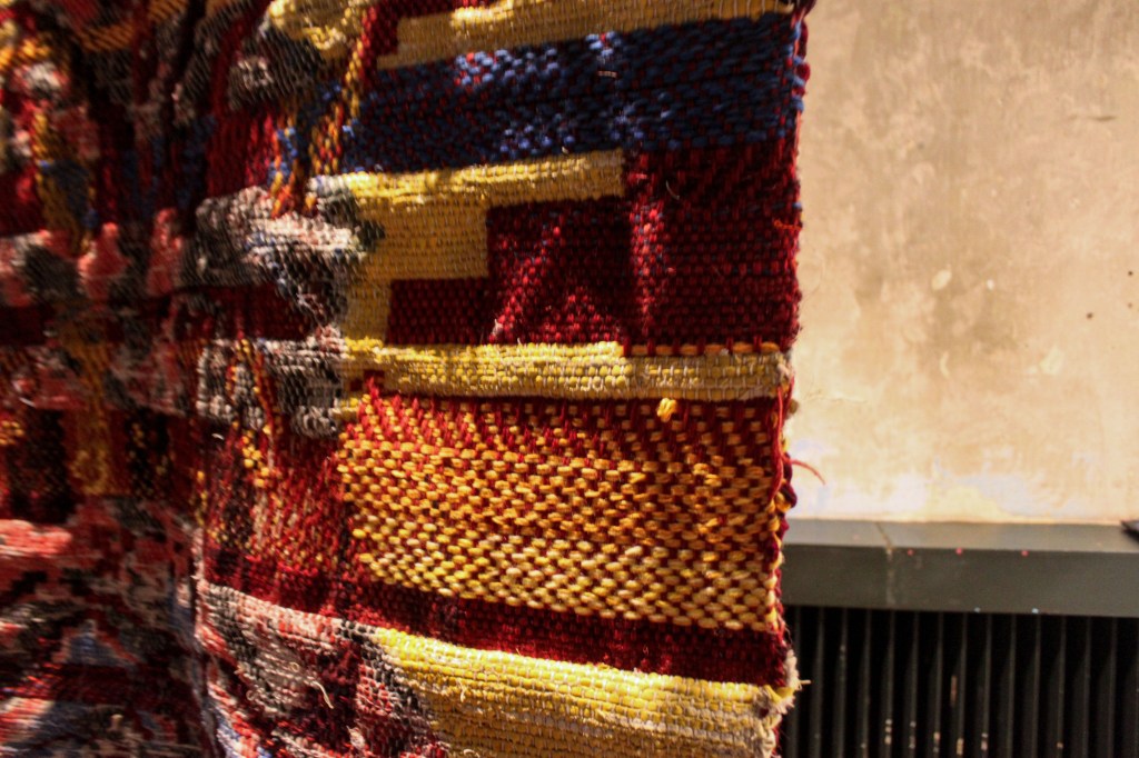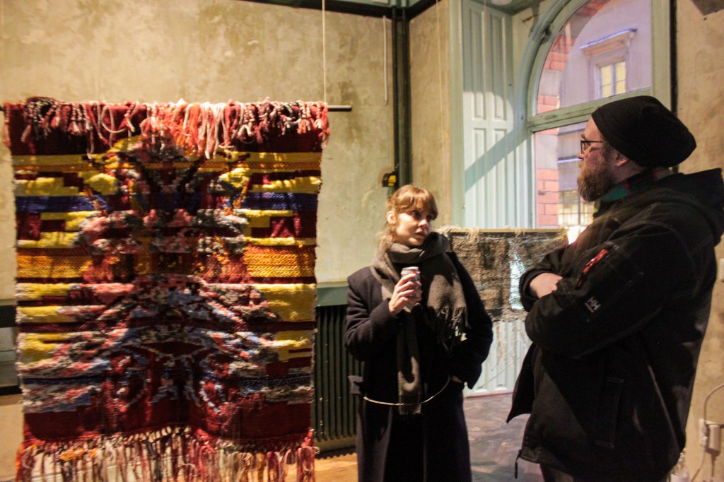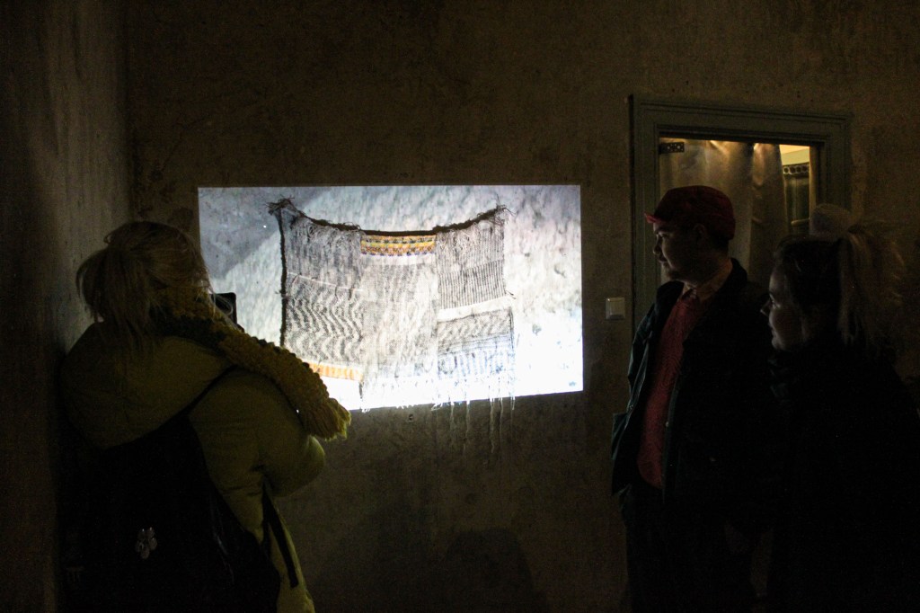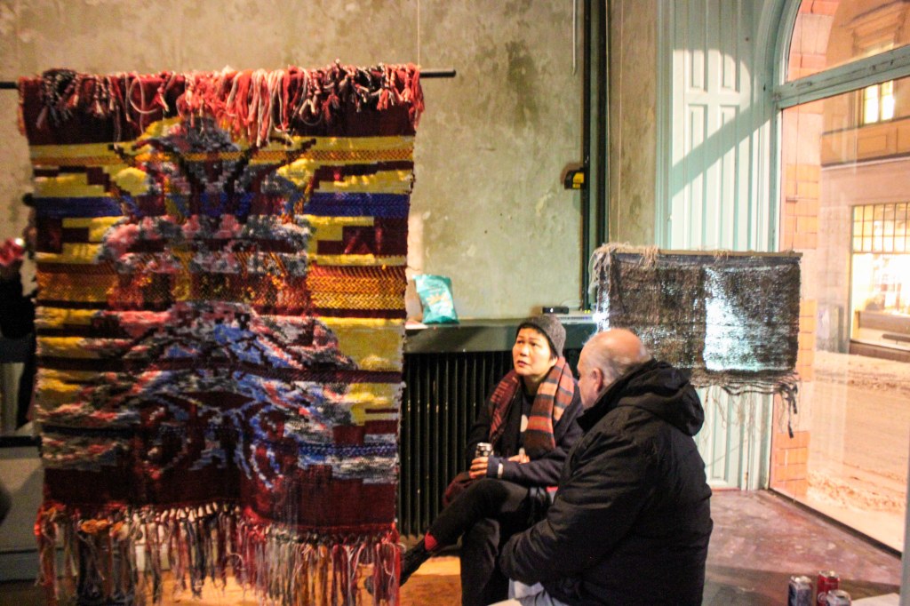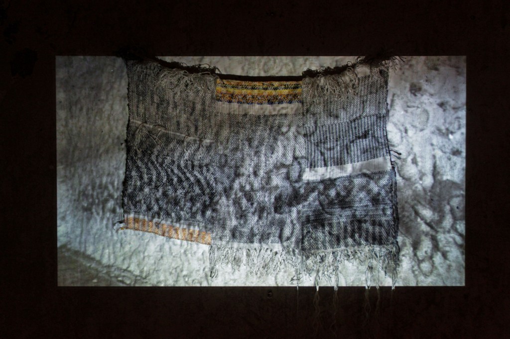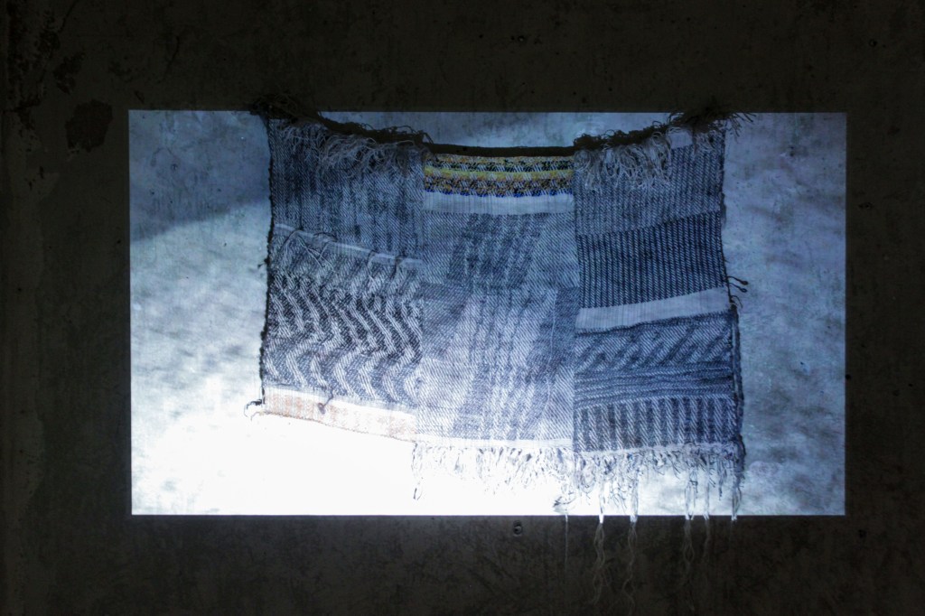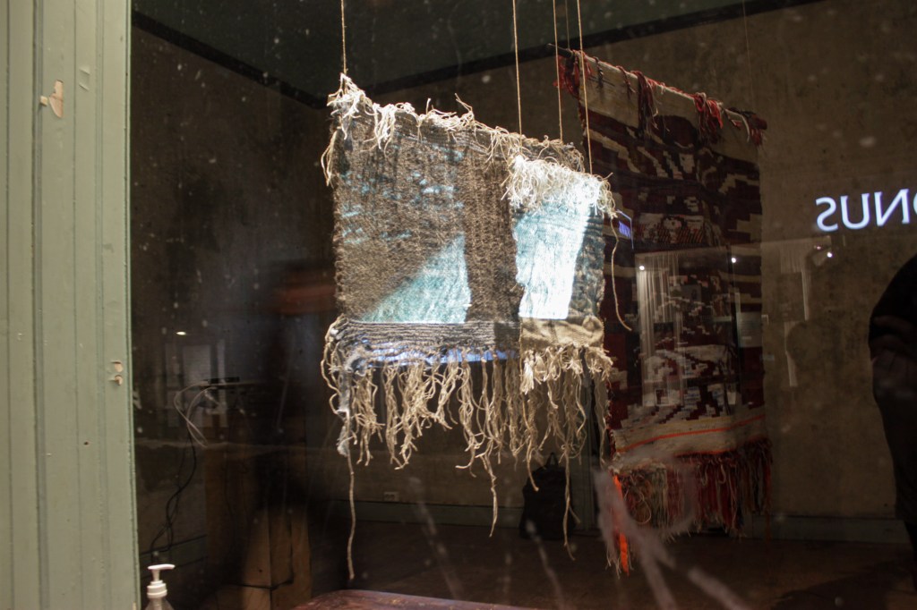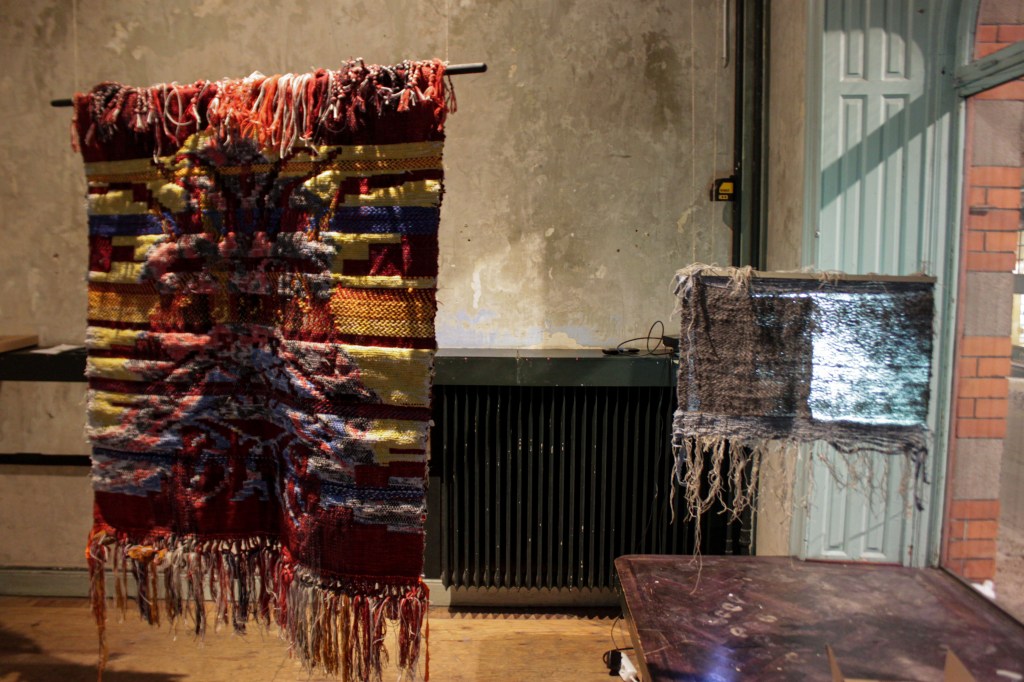 Nicola Godman and Josefin Gäfvert are Gotland-born artists. They studied together at a gymnasium in Visby, Gotland’s main city, and are currently both finishing their last year at Konstfack in Stockholm (in fine art and craft, respectively). The two artists started working together and developing the project Lammgiftet about a year ago, looking at the traditions and identity connected to their birthplace. I am always very fond of coming across artists who do not only set off to work together or present their work jointly, but who actually deeply complement each other and commit to a project to their utmost. The two artists’ practices seamlessly overlap in their disparate mediums – the striking hand-made weaves created from raw Gotland wool on a drawloom by Josefin Gäfvert, and Nicola Godman’s alluring and reflective video installations that are rooted in her farming background. The contrast of the raw and the smooth, the traditional and the modern in the artworks is further highlighted by the rawness of the exhibition space. The process of creating the works has been a journey and a collaboration, from researching and documenting the lambgift in-situ, collecting the raw wool to producing the pieces and reinventing them for a new space.