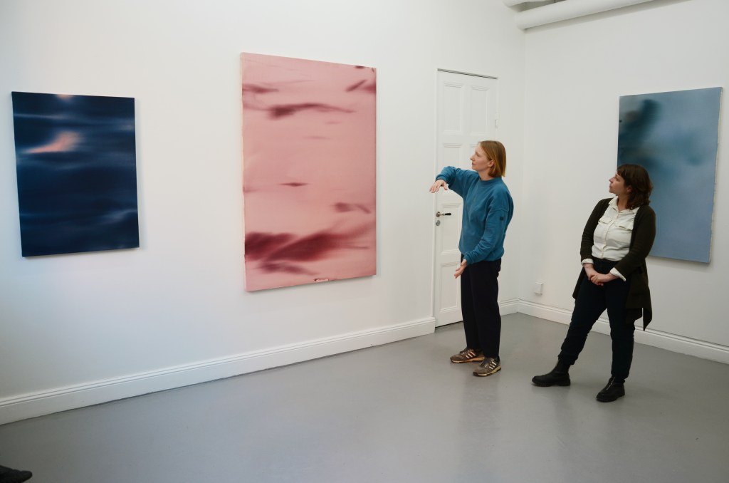 Hellgren has consciously built her artistic practice along this journey, where the shapes and structures are organically formed through the reactions of the material. By placing acrylic paint on the surface of a canvas and tilting it, the artist lets the material speak and reply to her questions. Questions and thoughts about longing are posed by the process of moving the canvas, placing the paint on it, and feeling the material. Where, metaphorically speaking, the various colour fields blend into each other and the superimposed acrylic layers transform into answers.
