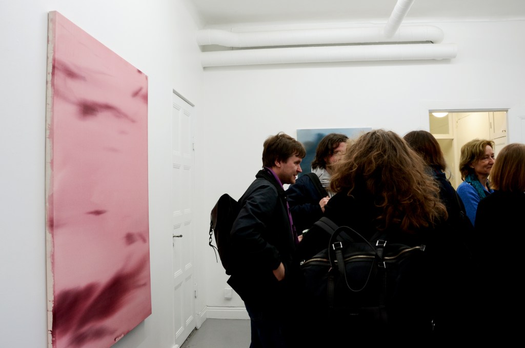 The paintings are acrylic on unprimed canvas. I’m drawn to the resistance in this technique, to the fact that I can’t predict the result. The obstacles give me a framework in which I can work intuitively. I add colour fields and brushstrokes onto the wet, stretched canvas. By tilting the paintings against the wall, the bleeding paint gets a direction, and the brushstrokes slowly fall out of their original positions. These fading gestures create a sense of movement. I can’t erase my failures in these works, I have to relate to them or start all over. What happens on the canvas and in the studio seems to be an analogy of life, and it all starts with a feeling of longing.” / Fanny Hellgren