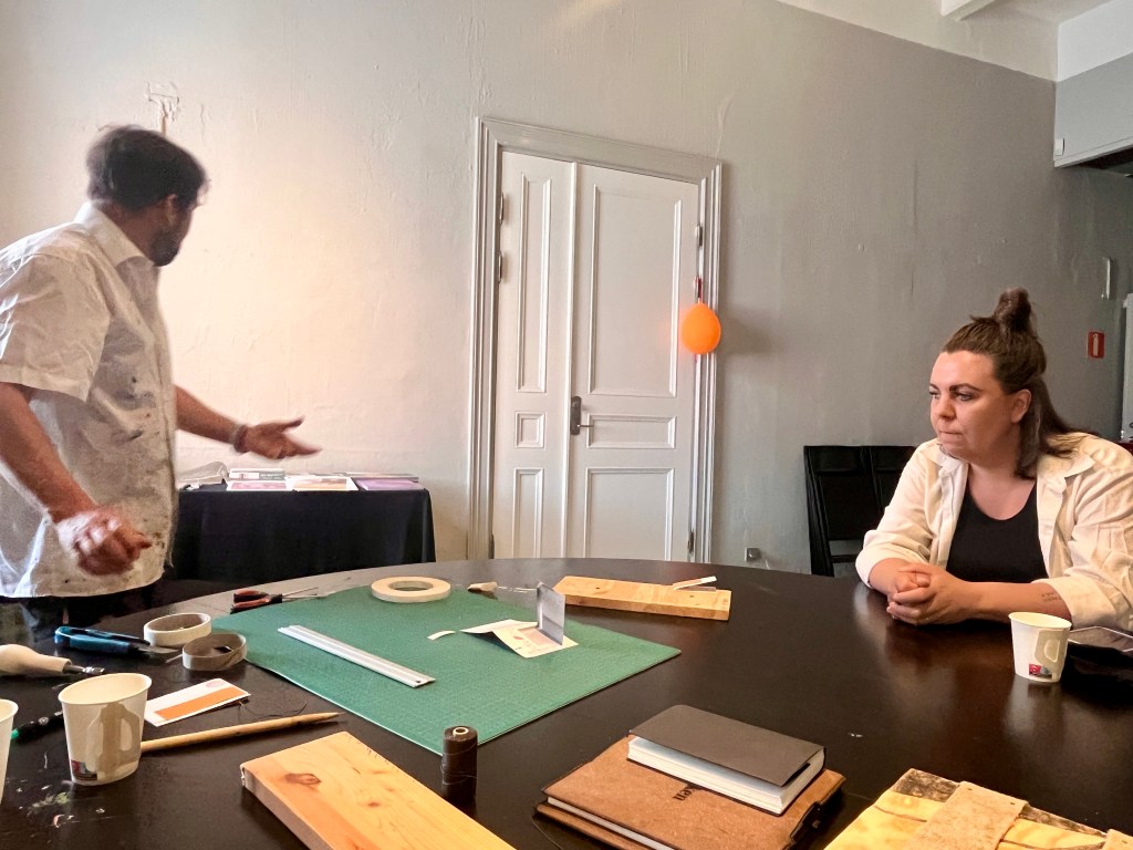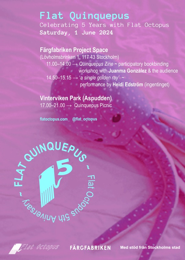 The anniversary event starts at Färgfabriken Project Space. Juanma González (Flat Octopus) introduces the audience to the world of bookbinding by showing and explaining a number of basic methods. As part of the workshop, you are warmly invited to participate and create your own unique Quinquepus Zine. For this, we will use the remaining copies of all exhibition brochures produced by Flat Octopus over the past years. Reactivating and upcycling our printed archive and bonding with our audiences through creativity is one of our ways to make this anniversary memorable, together with some surprises and fika.